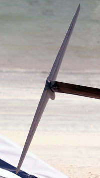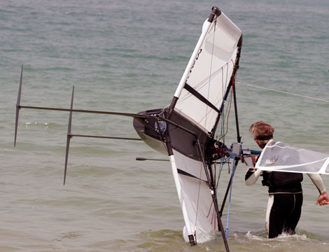 Present race leader Andrew McDougall, who is also the designer of the Bladerider and its now dominant McConaghy-built successor, is using a different set of foils on his Mach 2. The rudder is supposedly smaller than the typical Mach 2 foil, and a theory going around the fleet is that the changes are more significant than McDougall is letting on.