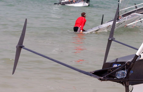 Mike Lennon success in marginal foiling conditions correlated directly with the weight of the crew, but it is also down to practice – he was out practicing in these conditions over the winter in the UK. But he also cites getting the gearing on the wand/foil mechanism right. “The slower you make the gearing, the less aggressively the flap moves, so I am using a very light gearing so the flap moves very slowly so in light airs as you try to lift up the flap is not coming off very quick, so it helps you lift off early.”
