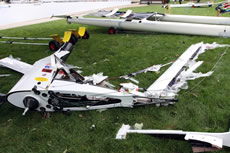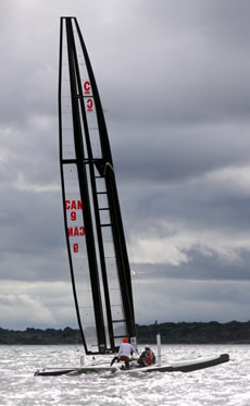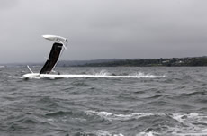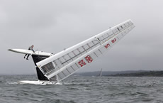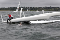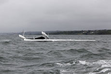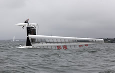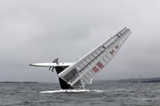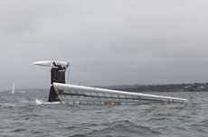 On the first leg disaster struck Steve Clark and Oliver Moore's Aethon, when thanks to the disturbed air off a freighter Moore was lost over the side, causing Clark to lose control of his catamaran causing it to fall over on its side, it skipper falling on to the delicate wing. Aethon ended up fully capsized resulting in her solid wingsail, the one that won Clark the LAC in 1996 and built with the precision of a Stradivarius, being turned to matchwood. This is a huge disappointment not only for Clark and Moore. Clark is the prime-mover in the C-Class, and held the International C-Class Catamaran trophy for 11 years, from 1996-2007. Clark has been as important to the class as Tony DiMauro was to the previous generation. See the full photo sequence below.