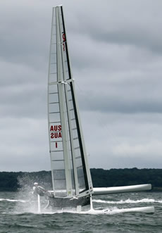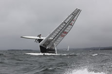 For the second race the wind had dropped to 12 to 14 knots. By this stage Ashby and Spithill, despite having had precious little time in the boat were looking increasing confident, Ashby flying the weather hull more regularly even at mark roundings. 2-0 to the Aussie hotshots.