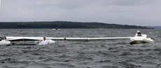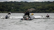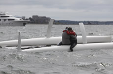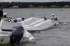 But Aethon was not the only casualty. Orion pulled out of the first race with a broken chainplate. Fortunately they were able to save the rig, although a couple of ribs were inside the wing were broken and they were able to be towed back to the New York Yacht Club with the wing laid across the platform. Patient Lady VI also suffered rudder problems which her French crew managed to fix in time to take thestarts of the second race.
