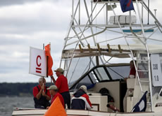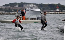 With the wind finally abated, today after a short delay ashore, racing finally got underway on day three of the Little America's Cup, otherwise known as the International C-Class Catamaran Championship held on Narragansett Bay out of the New York Yacht Club’s Harbour Court.