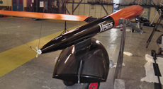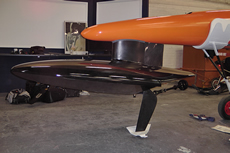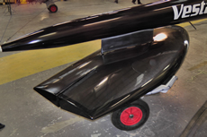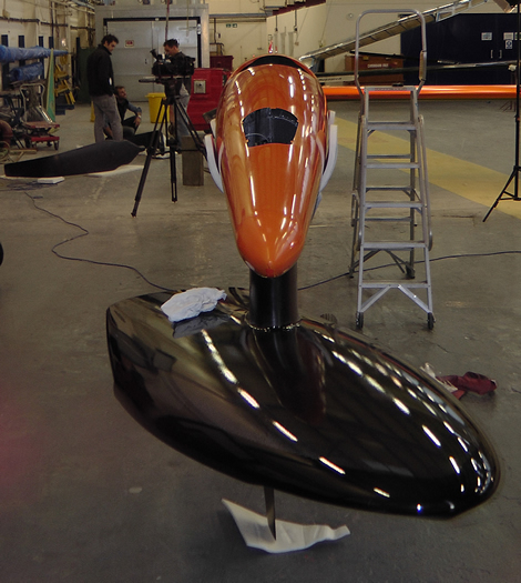 However it is the section of the foil that is most significant. At present Vestas SailRocket 2 has two options – a ‘standard’ foil to operate in sub-cavitation speeds, estimated to be around 52-55 knots, and an entirely different wedged-shaped ventilating foil (above) that should allow her to go beyond. Why not just use the latter? Because it is very draggy at low speeds and at this stage the team can only theorise as to whether it will enable Vestas SailRocket 2 to reach the speeds where it will become effective. Ideally you would use the first foil to get up to 50 knots and then somehow swap in the ventilated foil to take you beyond this. But the fact that the designers have moved this foil from beneath the hull on Mk1 to outboard of the fuselage on Mk2, where there is no potential to achieve the added efficiency of an endplate effect on the ‘conventional foil’, indicates they believe their future to be with the ventilated option.