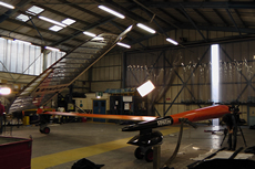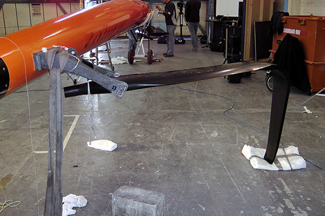Back up to weather and the foil set-up will be what allows Vestas SailRocket 2 to pass the speed record and beyond. On Mk1 the foil was located beneath ‘the hull’ but on the new boat it hangs out to weather and there is a neat arrangement where the inboard end of the foil plugs into a C-shaped strut attached to the fuselage, to ease launching.