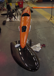 Most evident, and perhaps weirdest, is that the floats all appear to be constantly steering to port. In fact the floats are positioned at the angle SailRocket 2 will travel through the water, while the hull and the rig are pointing 20 degrees off to starboard into the direction of the apparent wind in order to minimise aerodynamic drag. So SailRocket 2 is not only set up to be a one tack wonder on starboard, but is also designed to operate at a specific apparent wind angle. When sailing it will appear to crab through the water and due to the orientation of the fuselage, according to Larsen, her total drag should be no more than that of a 74cm diameter sphere.