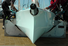 So the waterline shape is wider aft providing the crew with more stability when gybing and due to the fullness and because of the added buoyancy up forward this enables the rudder T-foil to be used more. “Even in medium to light breeze we’ll get the foil on really hard to get that knuckle down below the water,” says Henderson.
