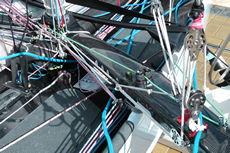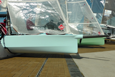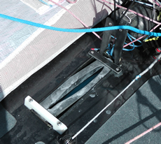 The centreboard is from Russell Brown to a Bieker design and can be gybed - articulating by +/- 4 degrees - to help eliminate leeway. This is by no means a new feature in the International 14 class, first tried back in the early 1980s. According to Henderson they only use it upwind, in pretty much all but the most blustery conditions. The gybing mechanism has some interesting features such as a locking device attached to the spinnaker tack line, so that whenever the kite is hoisted the board automatically centres itself. Controls for the locking mechanism is also led out to the rail. The reason for this is that at the Worlds they have reaching leg so there are times when they want the board locked centrally when they don’t have the kite hoisted.