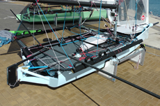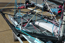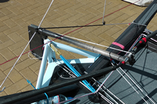 Another new feature of the Bieker 6 is her mast, which is fitted with one set of spreaders instead of two. The mast is a Bieker design, built by ICE in Hood River, Oregon using a high modulus carbon fibre tube. The diameter of the spar looks bigger but in fact it is the same as most other masts in the 14 fleet, only that it tapers less higher up. “It is a very straight mast, really stiff with hardly any luff curve cut into the mainsail,” says Henderson. Thus the shrouds are a metre higher than they might normally be on a twin spreader rig and this in turn allows a higher aspect jib to be used. The end result is less windage. Another development is due to the narrowness of the hull, the shrouds are now attached to the racks.