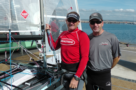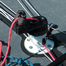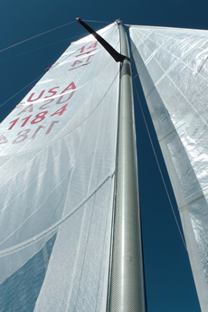 Henderson and Bersch typically sail with the ends of the main and jib sheets tied together, so that they are easier to locate. The jib sheet is on a 360degree swivel so that when they come out of a gybe it automatically untangles.