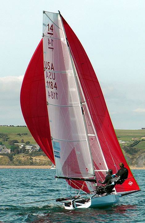 One of the most highly anticipated boats taking part in last week’s Artemis International 14 World Championship was the latest offering from design guru Paul Bieker. The last 14 design from Seattle-based Bieker, who has also been part of Oracle Racing’s design team, was the Bieker 5. These won the world championships in 2005 with Howie Hamlin and Euan McNicol and subsequently in 2008 and 2010 with Archie Massey. But in Weymouth last week was the first example of the new Beiker 6. This was being sailed by Kris Henderson, who builds the boat in Seattle, with Joe Bersch out on the wire, who is the money.