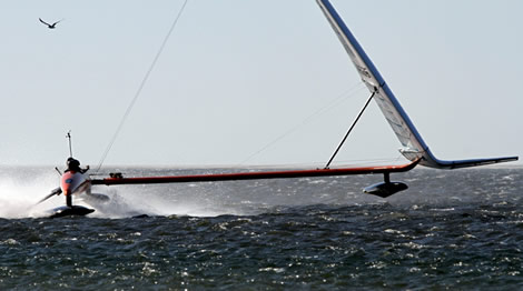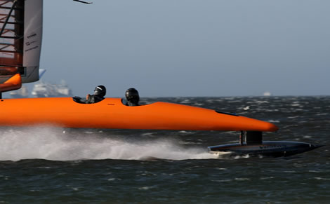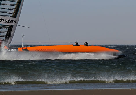 What has pleasingly proved to be the case is how quickly Vestas SailRocket 2 has got up to speed - much faster way than Larsen anticipated. “The progress has been quicker than we can almost come up with theories. We get a whole group of data from this boat and while we analyse that we go and do another run and all of a sudden we are going 5 knots quicker. We have got a very well developed VPP for this [non-cavitating] foil, but we are not going along in steady states on this boat. Even in that 50 knot run it is a series of surges down the course, and I’m sure that anyone from the kitesurfers to the windsurfers to even the Macquarie Innovations boys, would tell you that it is always the case down the course. It is not like you are slowly rumbling between 48 and 54 knots.”