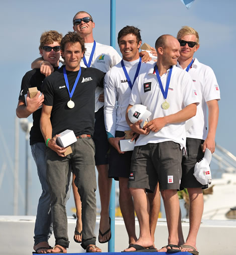 Second overall and 13 points behind the Australians were Peter Burling and Blair Tuke (NZL) who had incredible speed and showed amazing ability to pick the right shifts on the water all week. Danish Olympic team members Allan Norregaard and Peter Lang moved into the bronze medal position by having two good results earlier in the day and finishing 4th in the medal race, ending up 15 points behind second.