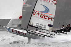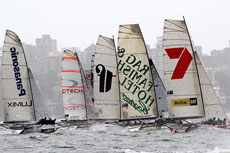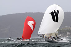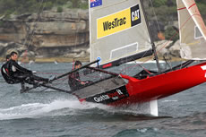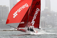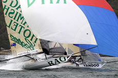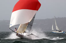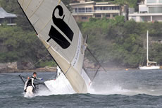 Thurlow Fisher Lawyers (Michael Coxon, Trent Barnabas, Dave O’Connor) led until the final rounding mark at Rose Bay but put on a performance to be remembered. They had capsized on the second windward leg but came back to lead the fleet home, before a spectacular capsize on the gybe as the crew ‘gunned’ it hard.