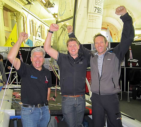 Field campaigned a DNA for a while and this remains the most prevalent boat in the class. Last year Mischa Heemskerk (above right with Chris Field and National Champion Phil Neal, left) won the A-Class Worlds in Pensacola, Florida aboard one and its Dutch manufacturer Advanced Racing Catamarans has churned out some 150 examples to date – a large number of the traditionally exotic catamaran. At the Europeans last year Field claimed the title but was beaten by an Australian, Andrew Landenberger, sailing a Swiss-designed Scheurer design (who in turn have a new model coming out – the D3 is being built by famous IMOCA 60 builder, CDK Composites in France).