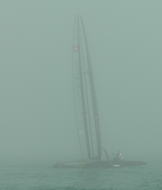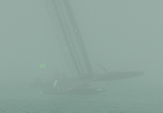 Sadly within 10-15 minutes, while the boats were about two thirds of the way up the first beat, a pea souper enveloped the fleet once more and, with it deemed unsafe to continue, PRO Ian Fraser pulled the plug on the race. At the time, Franck Cammas and Louis Viat on the new Groupama C were winning, while impressively, Invictus Challenge, sporting her three day old wing, was lying in second place.