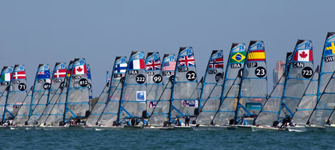 A striking fact about the ten boats in the Men's 470 fleet: Ten countries are represented. In order: Great Britain, New Zealand, Spain, New Zealand Sweden, Greece, South Africa, Russia, France, Japan.