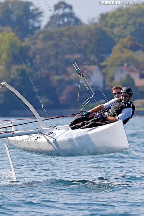 So two years on the latest ICCCC is being held on Lake Geneva, with eight teams competing (down from 11 in 2013). Rather disappointingly the hosts, the Hydros campaign, which fielded two brand new boats in 2013 aren't challenging this year and have rented out their boats to other teams, including three time Nacra 17 World Champion Billy Besson (who sailed with them in 2013). Of the eight only one boat, the Canadian university entry is new, although one imagines that considerable development work has been put into the other seven.