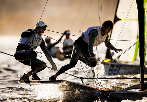 Team GBR's Dylan Fletcher and Alain Sign had to use all their experience to recover through the fleet after poor start in race one to cross the line in 15th, after a long delay both ashore and on the water waiting for the breeze to build in Guanabara Bay. After another shorter postponement as the wind dropped, their fortunes improved in race two as they secured their first top 10 finish of the event, again coming back after an iffy first beat.
