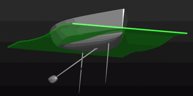 A hull passing through water creates a bow and a stern wave between which there is a trough. Obviously on a conventional boat this trough tends to be where the keel foil, the principle element in preventing leeway, is located.