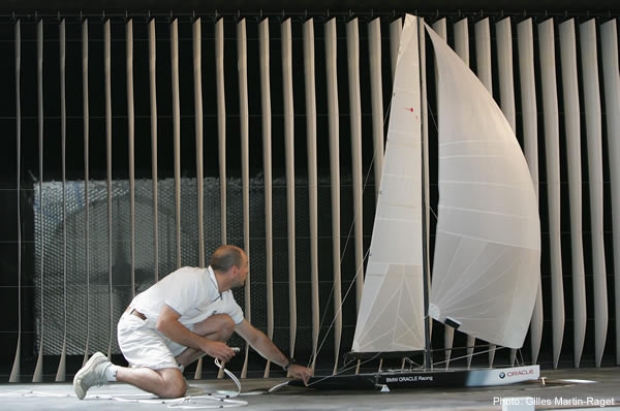 One limitation is the material used in the construction of the miniature sails. At BMW Oracle Racing they use the lightest spinnaker cloth to take the load but unfortunately this is unable to replicate the stretch characteristics of the full-sized sail. "We are not applying [relatively] the same load to it in the wind tunnel so we don’t get the stretch. So we have to cheat a bit by lowering the head slightly so it doesn’t fly quite in the wind tunnel as it would at full scale. So the cloth will only wrinkle in a certain way and the wrinkles tend to be a bit bigger in the wind tunnel," says Le Pelley.
