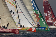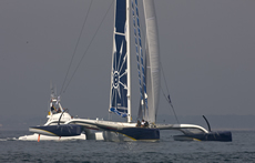 The appallingly named Happy Baie started on Friday and featured a fantastic line-up of boats. Previewing this autumn’s Route du Rhum were five ‘Ultime’ boats – the three Irens-Cabaret sisterships Francis Joyon’s IDEC, Thomas Coville’s Sodebo (both based in La Trinite) and Sidney Gavignet’s Oman Air, on which Gavignet recently demolished the outright fully crew Round Britain record – singlehanded. In addition there were two of Baron Benjamin de Rothschild’s Gitana fleet – Yann Guichard’s elongated ORMA 60 Gitana 11 and the former Innovations Explorer/Orange/Kingfisher maxi-cat Gitana 13.