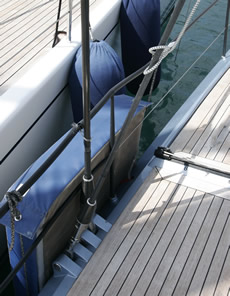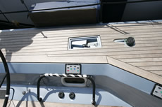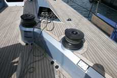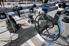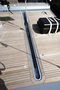 The cockpit is shallow with the traveller submerged into a lateral trench in the cockpit sole (as seems is the present trend – this comes with a cover fitted when at mooring to prevent the crew breaking ankles). There are primaries aft for the topmast backstays.