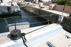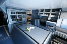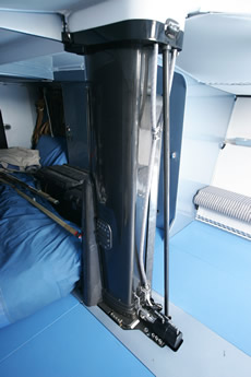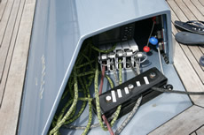 Unusually the hydraulic pump is mounted on the main engine in line with the prop shaft. The engine is a fully marinised VW five cylinder 165hp diesel. According to Mecoy this has a better torque curve than the Yanmar equivalent and it is lighter and quieter (the prop is direct coupling and isn’t a hydraulic drive). However there is a downside to this arrangement when using engine and winches simultaneously: “As you use the powered winches, the revs ramp up according to demand, so if I am backing into a dock and someone uses a winch and I go back at 9 knots! We have kill switches to prevent that.”