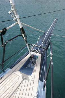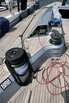 There is a giant foredeck hatch (complete with pneumatic seal) for dropping kites into and beneath this on the rear side is a giant roller for the take down system (the drop line runs aft to the transom and then up on deck and forward to the lazy runner winch).