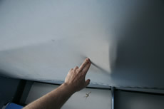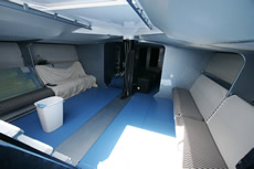 Under Wally rules 80% of the living area must be covered by something other than paint. So rather than having teak panelling as this rule presumably anticipated, instead the ceiling lining is in canvas that is stuck on by Velcro. Interior lighting his hidden behind this cover. Down either side of the saloon at lengthy seats built like pipecots and fitted with cushions.