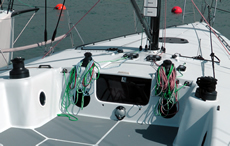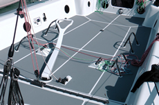 The rig is carbon although as you will soon read in our interview with Ngoni’s Kevin Sproul its bend characteristics are somewhat unusual, combined with the use of PBO discontinuous standing rigging. The main sheet is the ‘German system’, where a bight of sheet goes down to the track, the sheet ends going up the boom, diagonally down to the sidedecks and then back below deck to the cockpit.