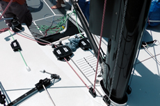 The rig has four halyards with a fraction kite halyard that isn’t typically used for racing. Jib fairleads are positioned via a transverse track with one control setting the lateral position, the other leading forward and then back to the pit area allowing adjustment of the up/down.