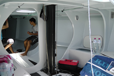 There is no gear below decks for a drop line for the spinnakers. As Nacho Postigo puts it: “That makes life harder. Judging distances to the mark – we can drop in two boat lengths? No, four boat lengths at least!” However teams are coming up with cunning ways of getting around this with what available gear there is (more again imminently from Kevin Sproul).