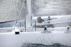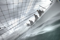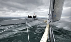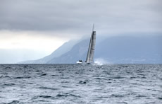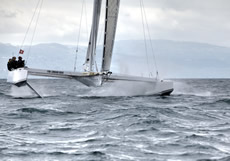 With their new boat Thèbault's team have made the same transition we saw in the boats for the 33rd America's in that she is a quasi-cat/tri with a flying centre hull to provide a more rigid footing for the fore and aft rig loads. The floats have seaplane-style stepped hulls as we saw on Yves Parlier'sMediatis Region Aquitaine cat, but she retains the V-foil configuration of the original L'Hydroptere with twin lifting T-foils on her rudders. This, remember, is the test platform for a new L'Hydroptere maxi, which is designed to break records offshore, ultimately including the Jules Verne Trophy.