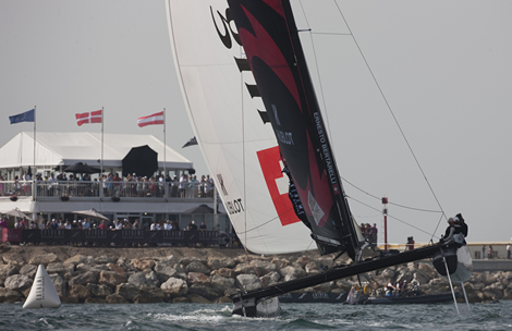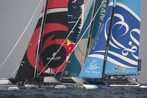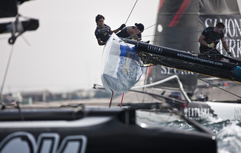 Today, the first of the weekend here in Muscat, Oman, the wind speed nosed into double figures for the first time and had veered onshore. The start line and leeward gate were positioned close to the VIP tent and spectator area allowing a bird's eye of the Extreme 40s as they undertook reaching starts, followed by a short opening leg and the heavy high speed congestion at the first mark and subsequently flew by the spectators on one hull under genniker. The tight stadium sailing action resulted in numerous penalties and a few scrapes, while Alinghi found herself entangled with race marks on two occasions.