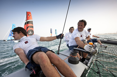 Despite 22 races now having been sailed over three days at the Extreme Sailing Series Muscat, the leaderboard shows no sign of easing up with season favourite Groupe Edmond de Rothschild, steered by French Tornado ace Pierre Pennec, still just one slender point ahead of Oman Air and her newbie crew led by American Morgan Larson. However the chasing pack are gaining momentum, with the Leigh McMillan-steered The Wave, Muscat closing to within four points of her teammates, leaving five of the eight teams in contention for the podium at the end of play tomorrow.