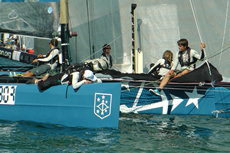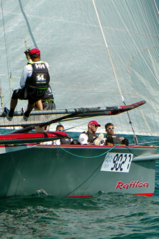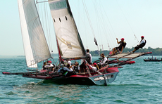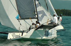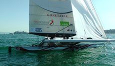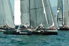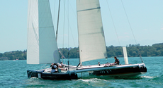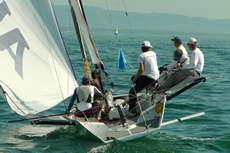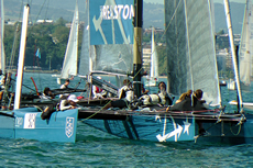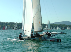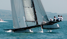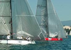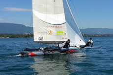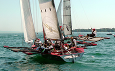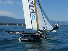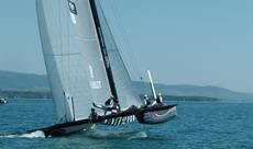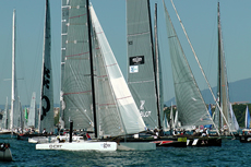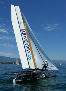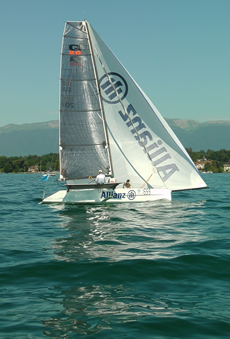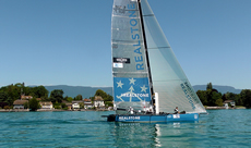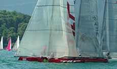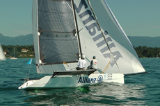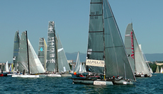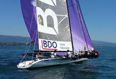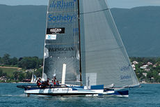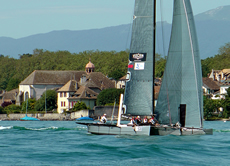 The Bol d'Or Mirabaud set sail on Lake Geneva on Saturday at 1000 with, as usual, the most diverse fleet of lake racers. The race got underway in zero wind, although some boats seemed to have the uncanny ability to make headway in a millpond, most notably Luis Sanjuan and his crew on the M2 catamaran KSR and Michael Aeppli on the Dynamic Stability Systems Quant 28 Allianz Suisse. The latter in particular did well on the Swiss side of the 'Petit Lac' at the start of the race before she was overhauled by Jerome Clerc's D35 crew on the eventual winners Realstone Sailing. Among the monohulls Raffica, the monstrous Hungarian Libera class boat was also doing well as were the two former Full Pelts.