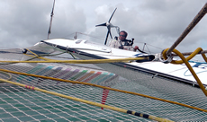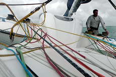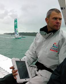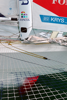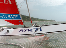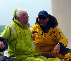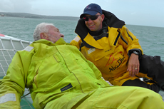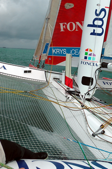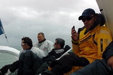 On board Foncia, joining Michel Desjoyeaux, currently fastest singlehanded monohull sailor around the world (84 days 3 hours 9 minutes), was appropriately Sir Robin Knox-Johnston, the first man to sail singlehanded non-stop around the world back in 1969 in the Sunday Times Golden Globe aboard Suhaili (312 days), but also a former holder of the Jules Verne Trophy with Peter Blake onboard ENZA New Zealand who set a time of 74 days 22 hours 18 minutes in 1994. Also with us was double Olympic silver medallist Ian Walker, recently returned from his second lap of the planet in the Volvo Ocean Race. Despite the numerous records held between Desjoyeaux and Knox-Johnston, Walker probably holds the highest peak speed of the three, having notched up 43 knots during the Volvo Ocean Race.