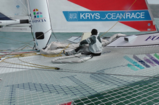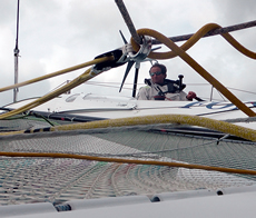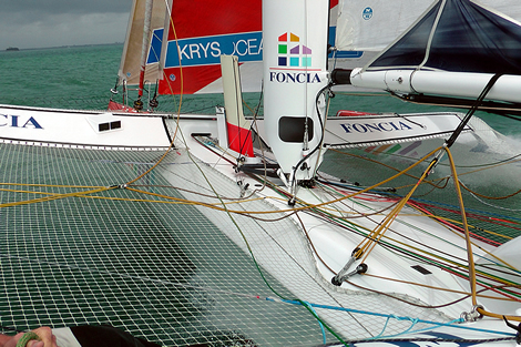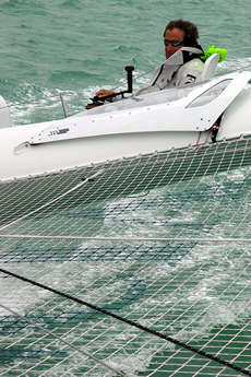 Meanwhile we were effectively ballast, positioned forward on the weather float up just aft of the forward crossbeam, heading in towards the main hull in the lulls and back out to the weather float again in the gusts.