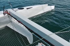 Traditionally going between foiling and non-foiling modes is an awkward crossover, but one of the keys to L'Hydroptère.ch, in addition to its relatively light 1.6 tonne displacement, is the ground-breaking retractable step in each of its hulls.