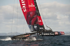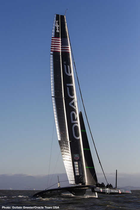 Should we be surprised that the AC72s are fully foiling? On the one hand no – the logical conclusion of the lifting foils fitted to the ORMA 60s to the MOD70s and on Oracle’s 33rd America’s Cup winning trimaran USA 17, is getting the leeward hull consistently clear of the water. But on the other hand the writers of the AC72 rule took some steps (but clearly not enough) to try and make sure that the new breed of America’s Cup catamarans wouldn’t fly.
