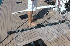 For the headsail sheets there is a transverse track with the jib rings each side operated in unison by hydraulic rams controlling the up/down and in/out. When in cruising mode these same rams are transferred to the jib sheets.