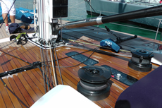 At the mast on Hamilton all the turning blocks are neatly hidden below the deck from where they are piped aft, but on Magic Carpet they are above deck, with lines passing back to the cockpit hidden inside the cockpit coaming. According to Wylie they were unable to hide the turning blocks on Magic Carpet 3 due to the deck camber and way the structure works down below. However it has benefits - “you get to see what’s going on all the time.”