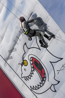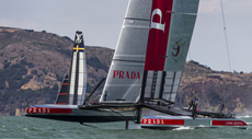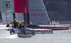 With Artemis Racing having had so little time to prepare - following the launch of their new AC72 'big blue' two weeks ago, today was just their ninth day sailing the giant complex catamaran, compared to the 80th day of sailing/racing for Luna Rossa - her first competitive outing was surprisingly spirited as she gained the better start than Luna Rossa. The Italian team was hampered when a few minutes prior to the start part of the film plastic 'Clysar' film covering the wing came detached from one of its internal frames requiring Prada posterboy Nick Hutton to be hauled aloft to effect a repair.