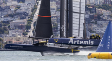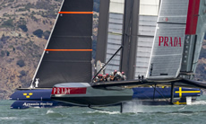Because of this and despite having the port entry where she should in theory have entered 10 seconds before her opponent, the Italian AC72 was late into the starting box, allowing Artemis Racing to cross comfortably ahead of her. The pre-start was fairly tentative, the Italian because of their wing issue, Artemis Racing due to the novelty of it all. However Aussie 49er gold medallist Nathan Outteridge at the helm of the Artemis Racing AC72 surprisingly made a better job of the start, managing to get the leeward berth. Outteridge's opponent Chris Draper attempted to thread the Luna Rossa AC72 round to weather but the Swedish team did a good pull in pulling the trigger and their acceleration out of the start prevent Luna Rossa getting past.
