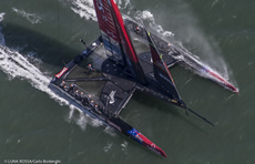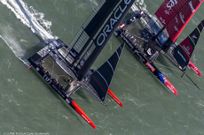 Crucially at the leeward gate, Emirates Team New Zealand took the port hand mark, while Oracle Team USA had put in an extra gybe on the run allowing them to round the starboard mark, creating a split going up the beat. As expected, the Kiwis tacked to cover and at the first cross were clear ahead on port, continuing on. But it was immediately noticable that Oracle Team USA was no longer looking like a pig during her tacks and her straight line speed upwind was looking every bit as impressive as the Kiwis'.