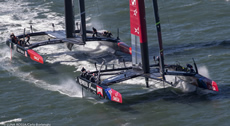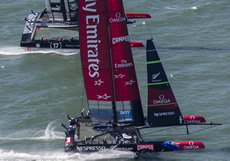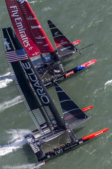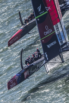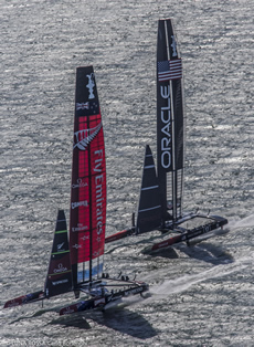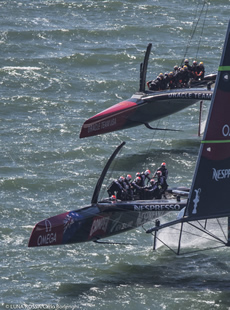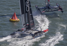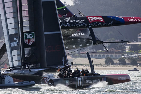 So after number Oracle start wins, Barker had managed to pull one back with the Kiwis leading into the reaching mark and also on the run. Somehow Oracle Team USA was looking much more comfortable today with less 'dolphining' downwind but with Emirates Team New Zealand still slightly faster through the gybes.