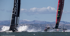 Despite an impressive nose dive while rounding the mark, Oracle Team USA remained attached to the Kiwi's transom down the run, with Barker and his crew doing a good job to cover them. Unfortunately by the time the Kiwis had committed to rounding the starboard hand gate mark, Oracle Team split and rounded the port mark. At the first cross Oracle coming in on port took the Kiwi's transom. On the next cross on port they were two to three boat lengths ahead. And from there it was all over. Oracle extended and extended showing their prodigious upwind pace.