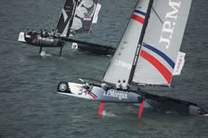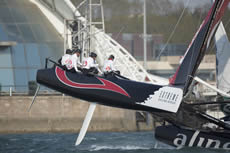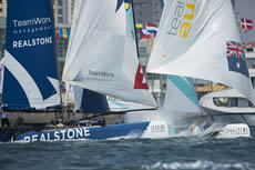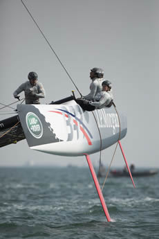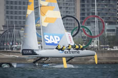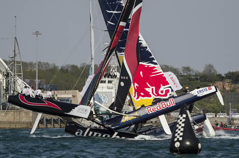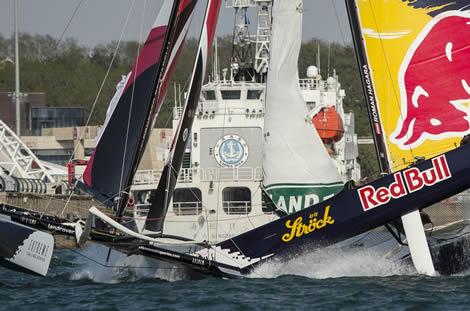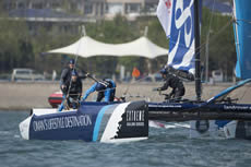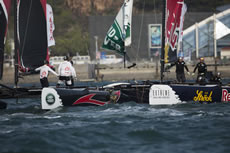 Racing today saw one of the biggest crashes in the Extreme Sailing Series’ eight-year history, when Red Bull Sailing Team T-boned Alinghi knocking the Swiss out of racing. However this wasn't enough to stop the Alinghi team of Morgan Larson, Anna Tunnicliffe, Nils Frei, Pierre-Yves Jorand and Yves Detrey, who took victory despite watching the final races from the dock, after the international jury awarded the Swiss boat redress, much to helmsman Larson’s relief.