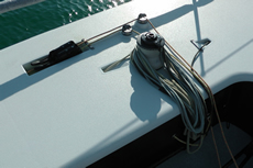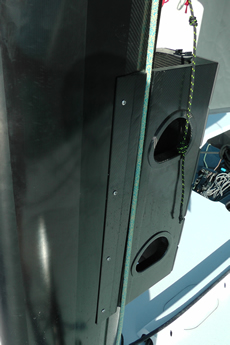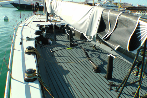 The jib sheet fairlead is operated from a lateral track each side with the line controlling the up-down leading forward and the car on the track, determining inboard-outboard control (and the sheeting angle) is operated via a hydraulic ram located on deck under a cover immediately aft of the mast.