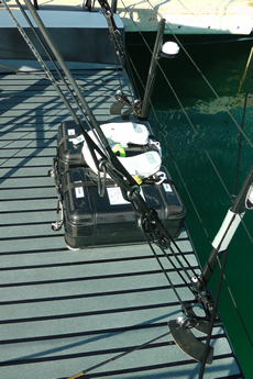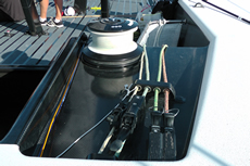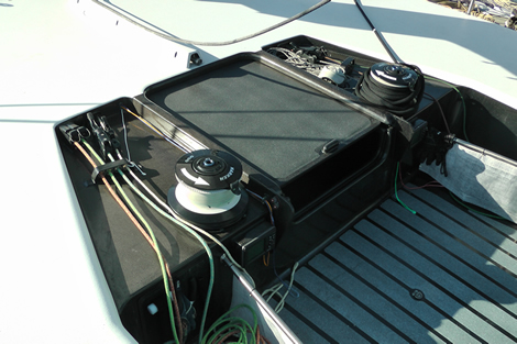 The traveller has its own pair of smaller winches located aft and slightly outboard of the main primaries. The spinnaker sheets are on a system similar to Diverse’s Reeler that sucks the sheet ends down below to keep the cockpit clear. “They seem to work alright, but you have to manage them,” advises Powell.